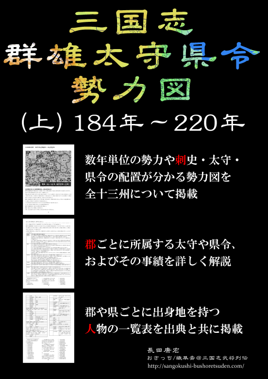 三国志の州ごとの勢力図を数年ずつに分け、刺史・太守・県令・その他勢力を「三国志」「後漢書」「晋書」「華陽国志」など各種史料からできる限り収集してまとめた同人誌「三国志 群雄太守県令勢力図(上)(下)」です。