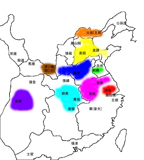 | 大将軍 | 袁紹 | 公孫[王賛]の領土を徐々に奪い、易京を数年間包囲した上199年に公孫[王賛]を滅ぼす。張楊の残存勢力を取り込んで并州にも進出、長男の袁譚を青州刺史に置いた。北方の烏丸などの異民族とも盟約を結び、一大勢力を築く。 |